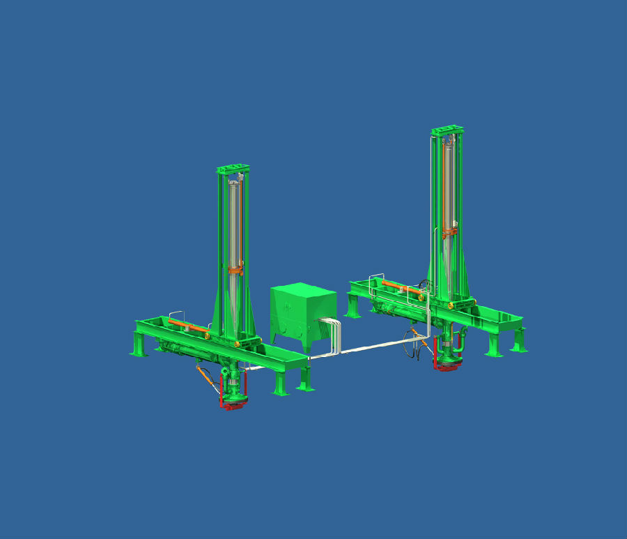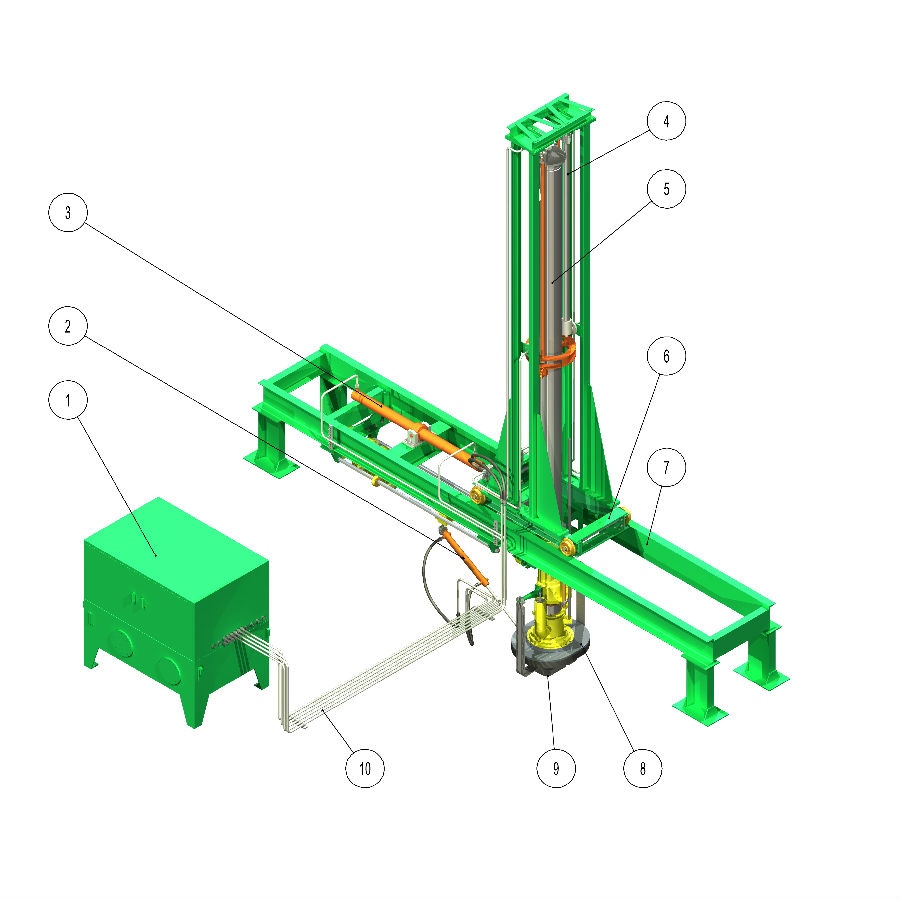 1.液压站2.驱动接油斗的液压缸3.水平驱动液压缸4.外液压缸式链条倍增机构5.升降管、三通及延伸机构6.精对位行走小车7.导轨8.密封帽9.接油斗10.不锈钢液压管线。