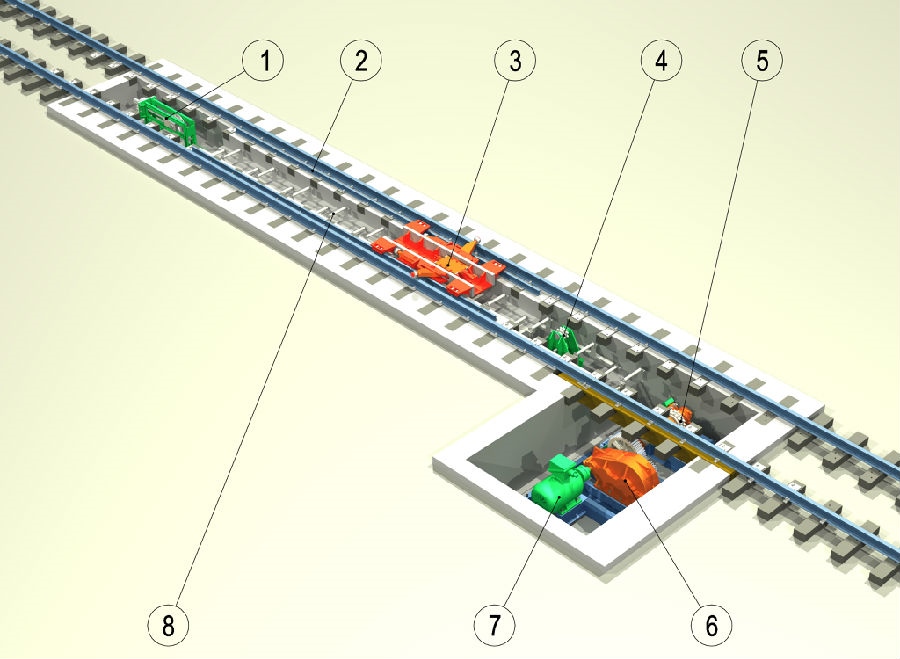 牵引装置主要是由1.张紧装置2.爬车轨道3. 小爬车4. 链传动支撑5.链传动装置6.减速装置7.电动机8. 托辊组成。