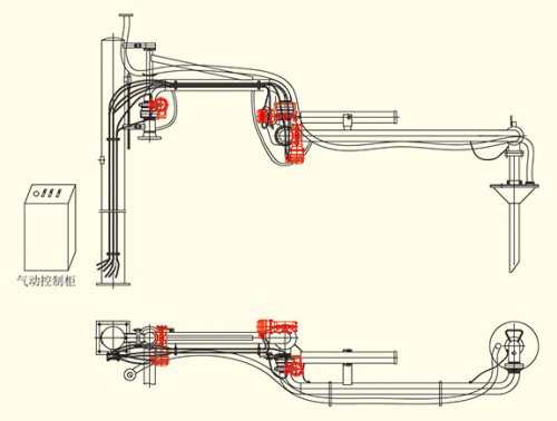 气动(或液动)装车鹤管是一种安装气动马达(或液压马达)的改进型鹤管。其工作原理是通过气源驱动马达带动内、外臂转动。相比常规鹤管,只需要操作气动控制箱(或液压系统)就可以实现鹤管在三维空间自由运动,在作业非常繁忙或环境比较恶劣的场所,代替人工进行操作,降低操作人员劳动强度。可配置回气管、密封帽、溢油静电报警等附件。